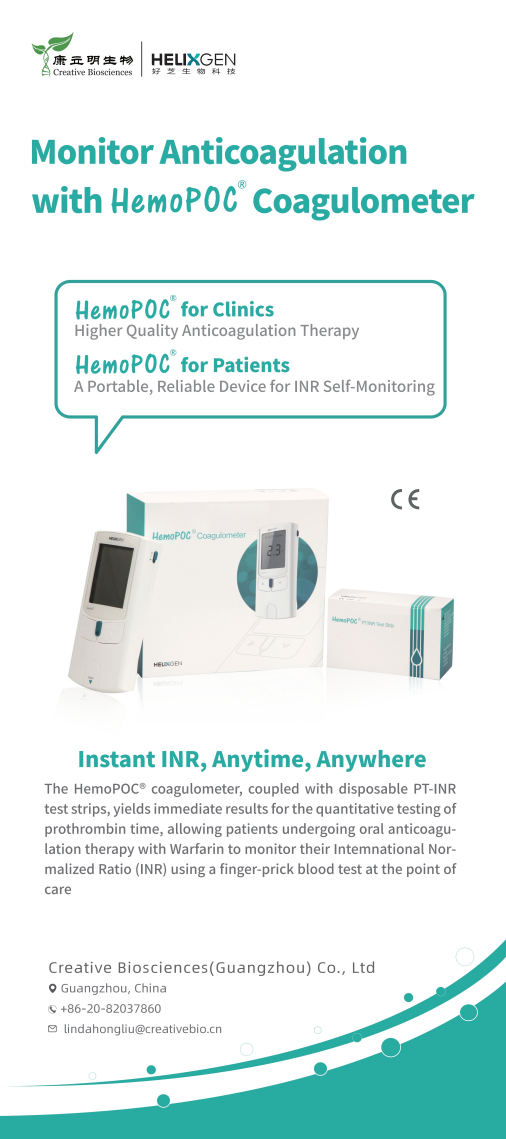 此外,康立明全資子公司好芝生物產(chǎn)品HemoPOC®凝血檢測系統(tǒng)也將亮相此次檢驗盛會。HemoPOC®凝血檢測儀是一款便攜式凝血檢測設(shè)備,與配套的檢測卡組成。HemoPOC®凝血檢測系統(tǒng),用于定量測定新鮮指尖毛細(xì)血管血的凝血酶原時間。該系統(tǒng)操作簡單(凝血檢測操作視頻),滿足即時檢測及床旁檢測的應(yīng)用需求,增強抗凝管理和慢病管理的有效性。