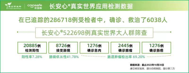 作為持續(xù)披露真實(shí)世界應(yīng)用數(shù)據(jù)的腸癌糞便基因檢測(cè)產(chǎn)品長安心®,截至2022年10月30日,共完成522698例前瞻性應(yīng)用檢測(cè),其中286718例應(yīng)用數(shù)據(jù)可追溯,20885例受檢者長安心檢測(cè)結(jié)果陽性(陽性率7.28%),其中8726例陽性檢測(cè)結(jié)果的受檢者進(jìn)行了腸鏡復(fù)查(腸鏡依從性41.78%),有6038例受檢者接受了確診與救治,其中1276例腸癌,2445例腺瘤,1276例息肉。