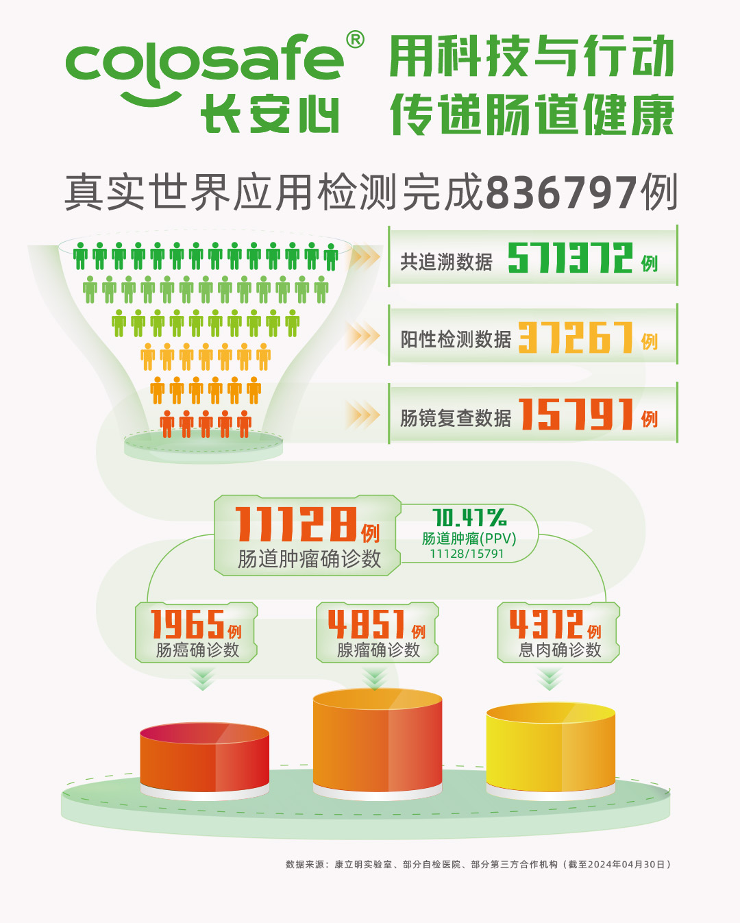 截至2024年4月30日,長安心®共完成836797例檢測,其中可追溯數(shù)據(jù)571372例。檢測結(jié)果陽性37267例(陽性率6.52%),均建議進行腸鏡復查。其中,15791例檢測陽性受檢者進行了腸鏡復查(腸鏡依從性42.37%),共發(fā)現(xiàn)11128例需要治療的受檢者,其中腸癌1965例、腺瘤4851例、息肉4312例。長安心®腸癌陽性預(yù)測值(PPV)12.44%,腸道腫瘤陽性預(yù)測值(PPV)70.47%,檢測性能優(yōu)異。