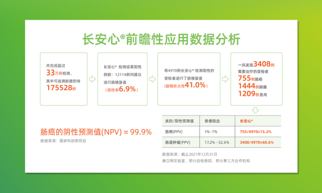 糞便DNA檢測技術,正成為腸癌篩查中的重要一環(huán)??盗⒚魃锸紫袌龉汆嚂郧侔l(fā)布的腸癌糞便基因檢測產(chǎn)品“長安心”最新前瞻性應用數(shù)據(jù)顯示,截至2021年12月,長安心共完成33萬例前瞻性篩查,其中175528例篩查數(shù)據(jù)可追溯,12114例受檢者檢測結(jié)果陽性(陽性率6.9%),其中4970例檢測結(jié)果陽性的受檢者進行了腸鏡復查(腸鏡依從性41.0%),一共發(fā)現(xiàn)3408例需要治療的受檢者,其中755例腸癌,1444例腺瘤,1209例息肉?!伴L安心”對腸道腫瘤的陽性預測值(PPV)為68.6%(其中腸癌的陽性預測值為15.2%),來自國家科技部項目的數(shù)據(jù)顯示,長安心的陰性預測值達99.9%。